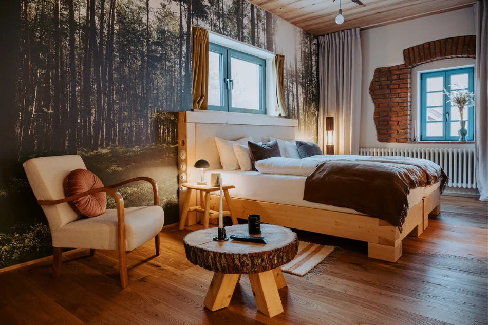 Halten Sie inne und entspannen Sie sich inmitten der Natur. Das Zimmer „Wald“ ist von der lokalen Landschaft inspiriert, ihren tiefen Wäldern, saftigen Wiesen und dem Duft der Birken nach dem Regen. Die Atmosphäre der Ruhe und Verbundenheit mit der Umgebung wird durch die Birkenwand und die sanften Farben des Interieurs unterstrichen. Das dominante Bett aus alten Dachbalken, zwei Meter breit, bietet einen gemütlichen Rückzugsort, an dem Sie sich von der Natur umarmen lassen können, ohne nach draußen gehen zu müssen.