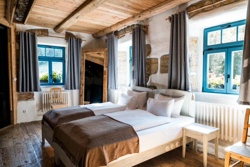 Erleben Sie die authentische Atmosphäre eines Müllerhauses. Das Zimmer „Světnice“ befindet sich im ehemaligen Wohnzimmer, das als Inspiration für die gesamte Inneneinrichtung diente. Sandsteinwände, Holzböden und Blautöne unterstreichen den ländlichen Müllerstil. Dank der nach Osten ausgerichteten Fenster ist das Zimmer schon am frühen Morgen von Sonnenlicht durchflutet. Das Licht und der Sandstein spiegeln sich in der schwarzen Glaswand wider, die das Zimmer vom Badezimmer trennt und dem Raum einen einzigartigen Charme verleiht.
